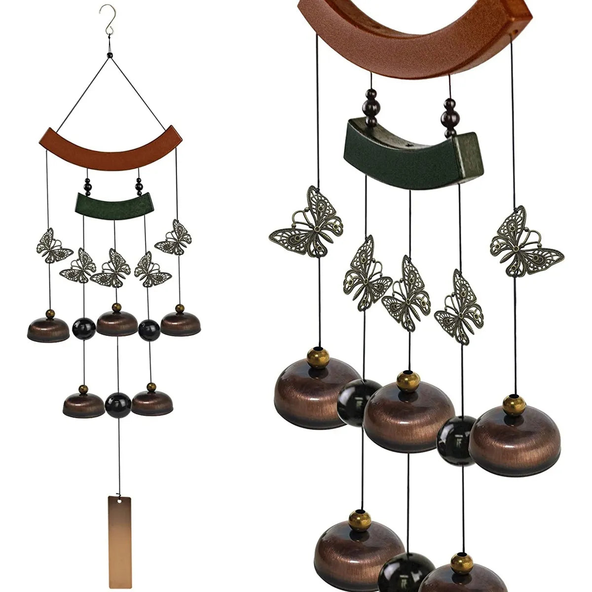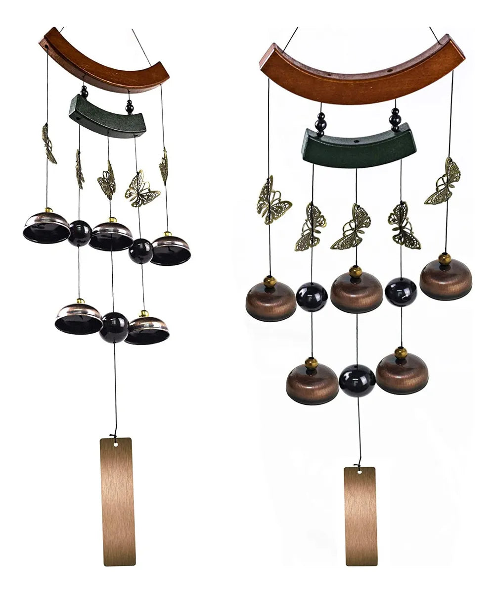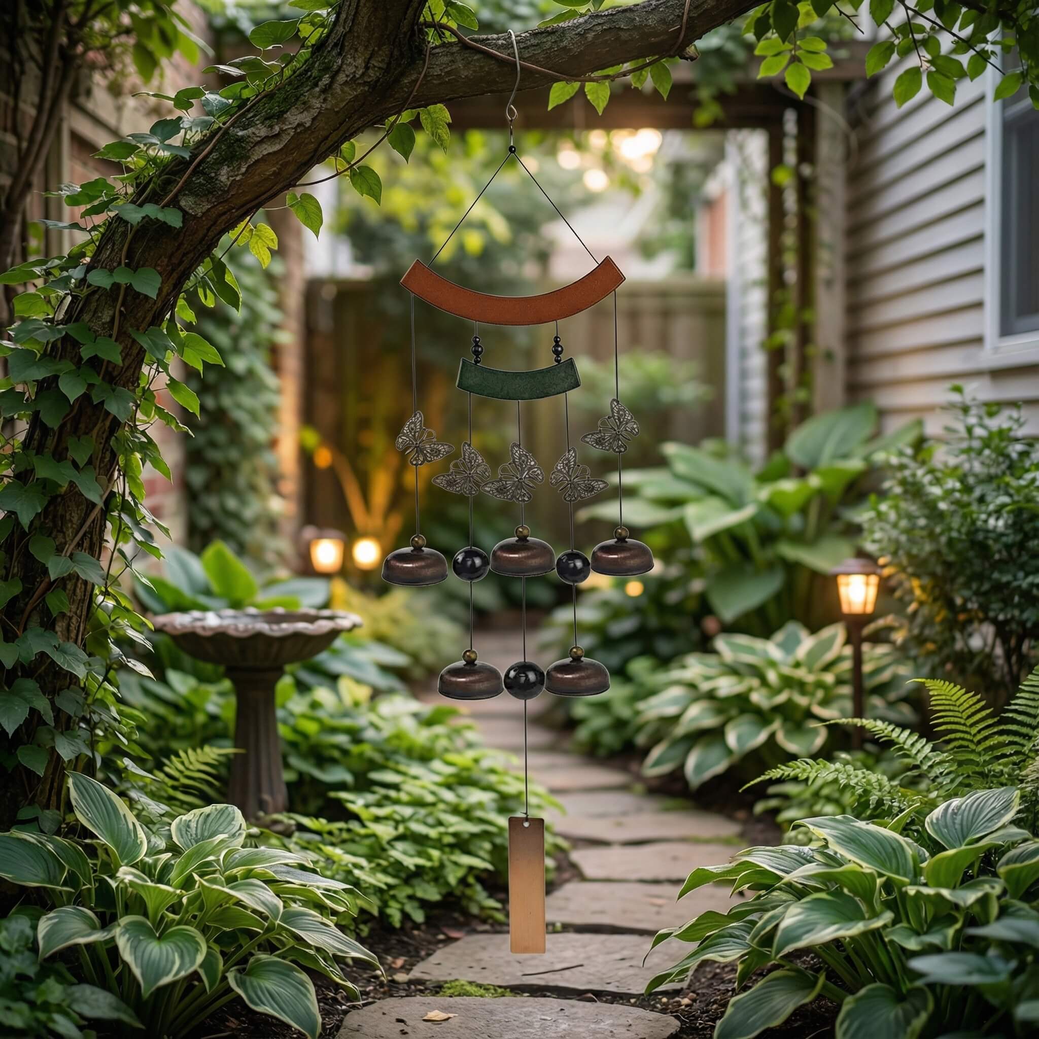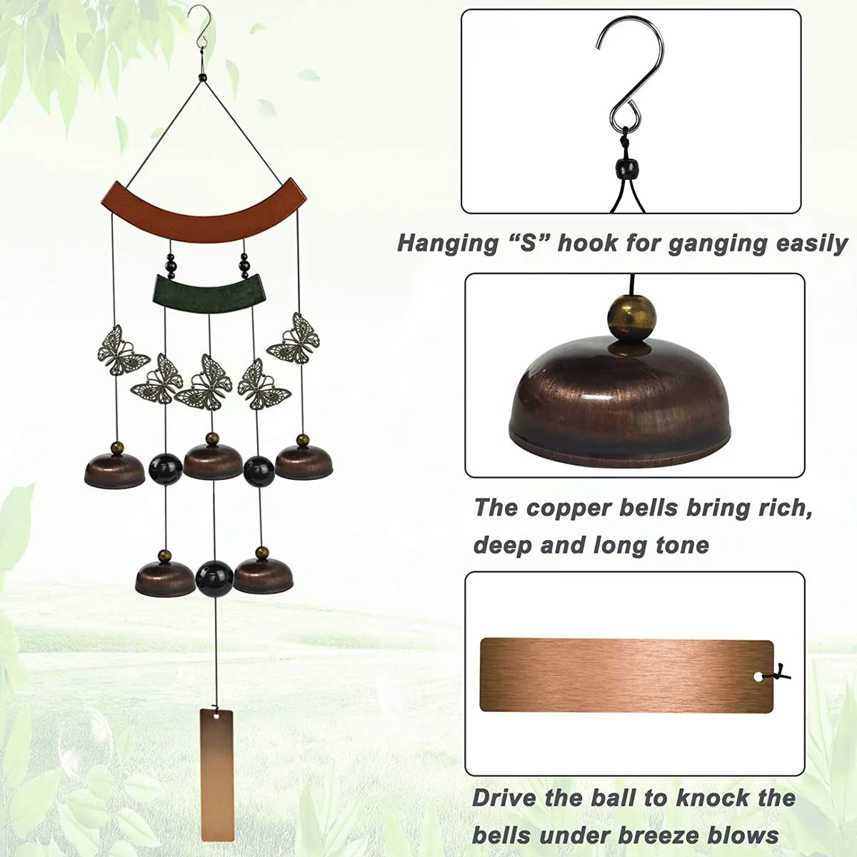 This handcrafted bronze wind chime features 5 delicate butterflies, 5 antique copper bells (2-inch diameter), 3 black spheres, and 1 rectangular pendant, all secured with durable nylon cord. The 5 metal bells produce deep, rich, and melodious tones that resonate beautifully in the breeze, creating a soothing symphony for your outdoor sanctuary.