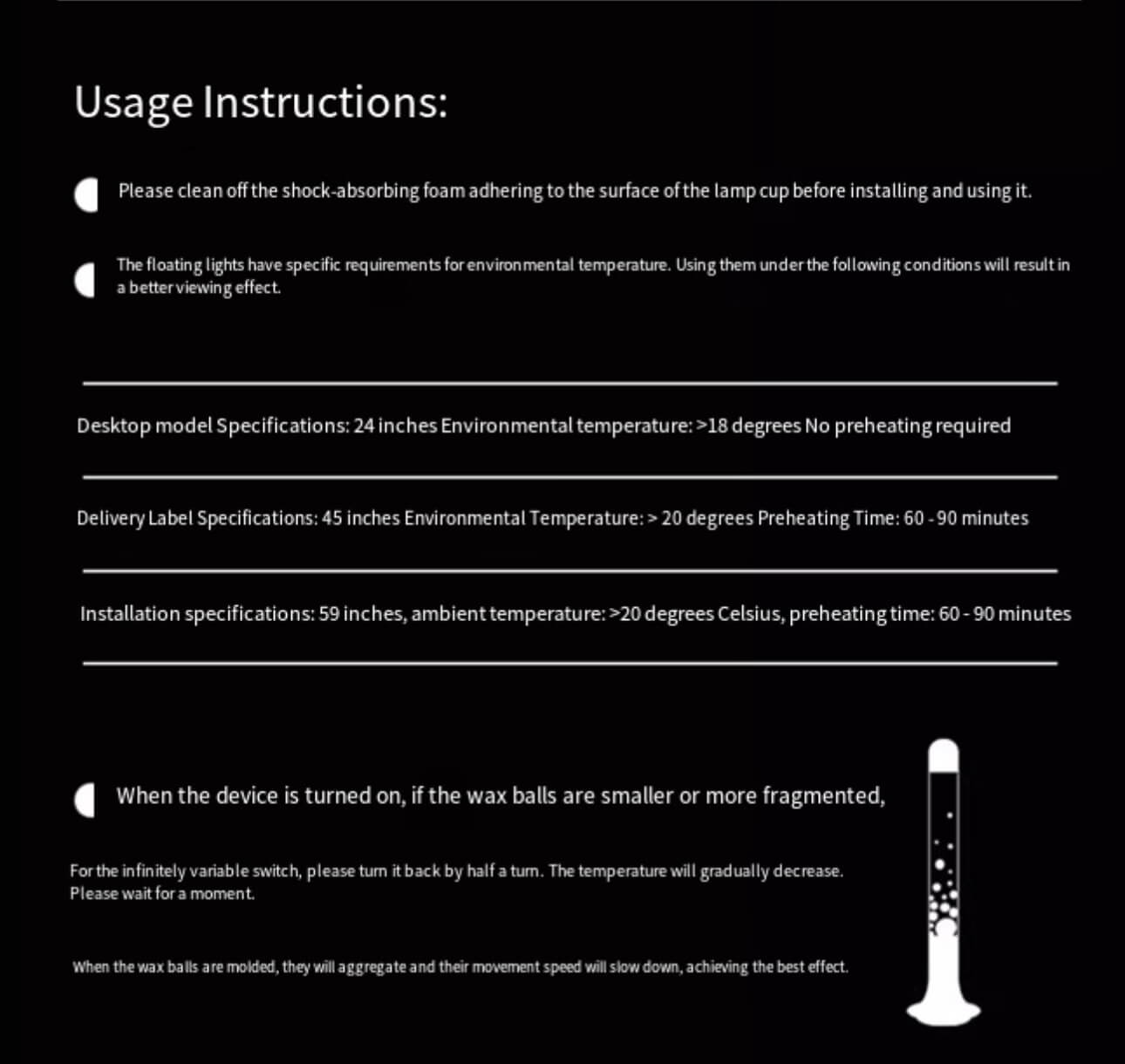 Note: The Floating Healing Floor Lamp is temperature-sensitive. During winter, indoor heating must be activated. The multicolor effect will begin displaying after 50-90 minutes. Simple installation is required, with an installation video provided.