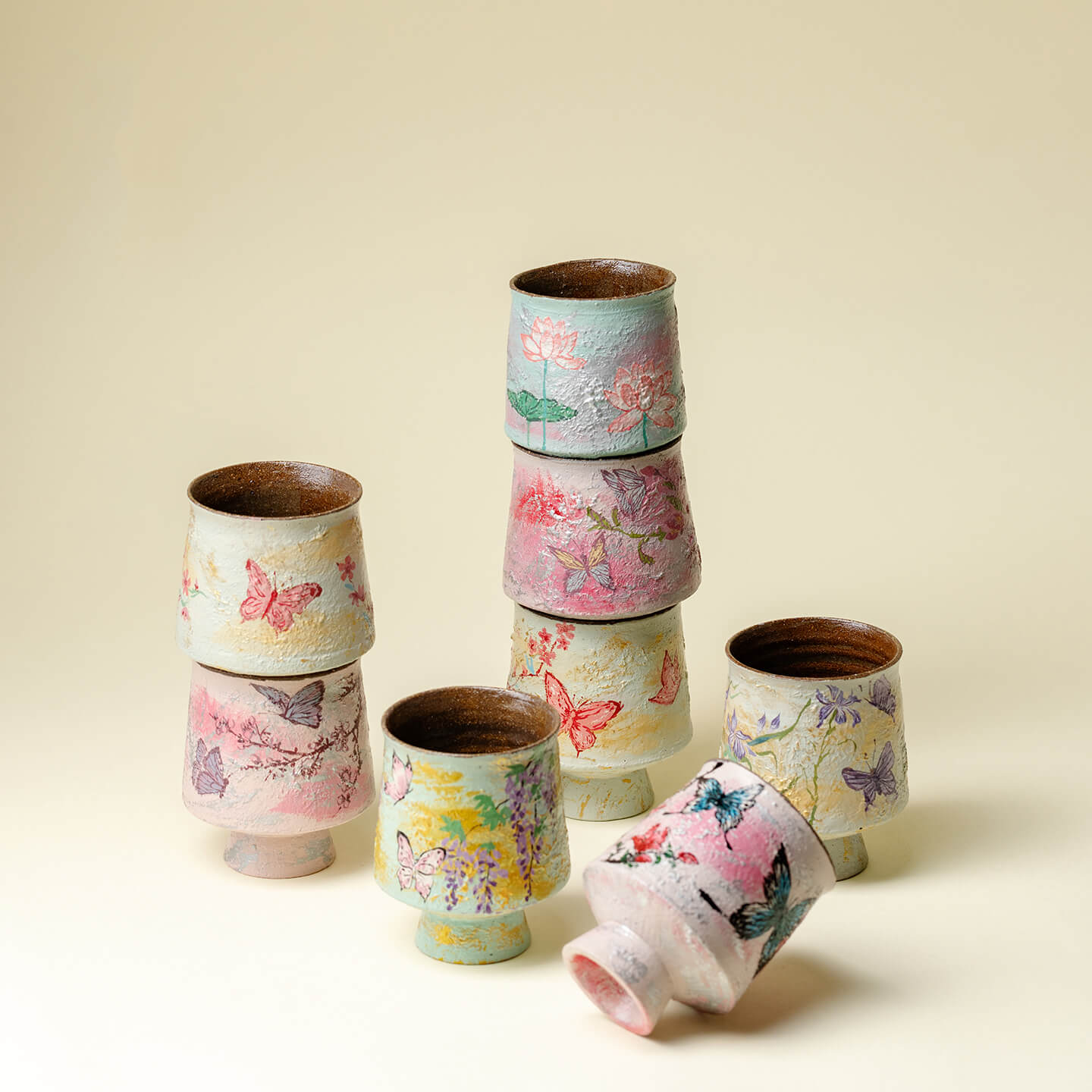 Each cup showcases a different hand-painted butterfly species, celebrating the diversity and beauty of these graceful creatures: