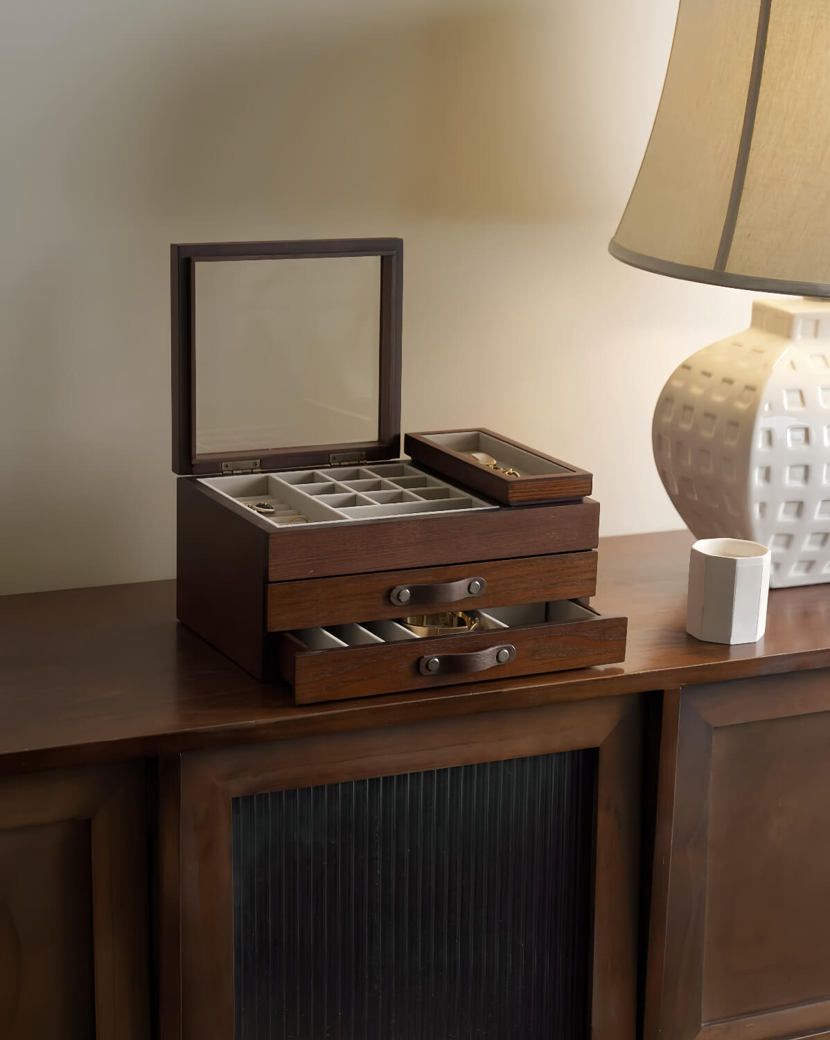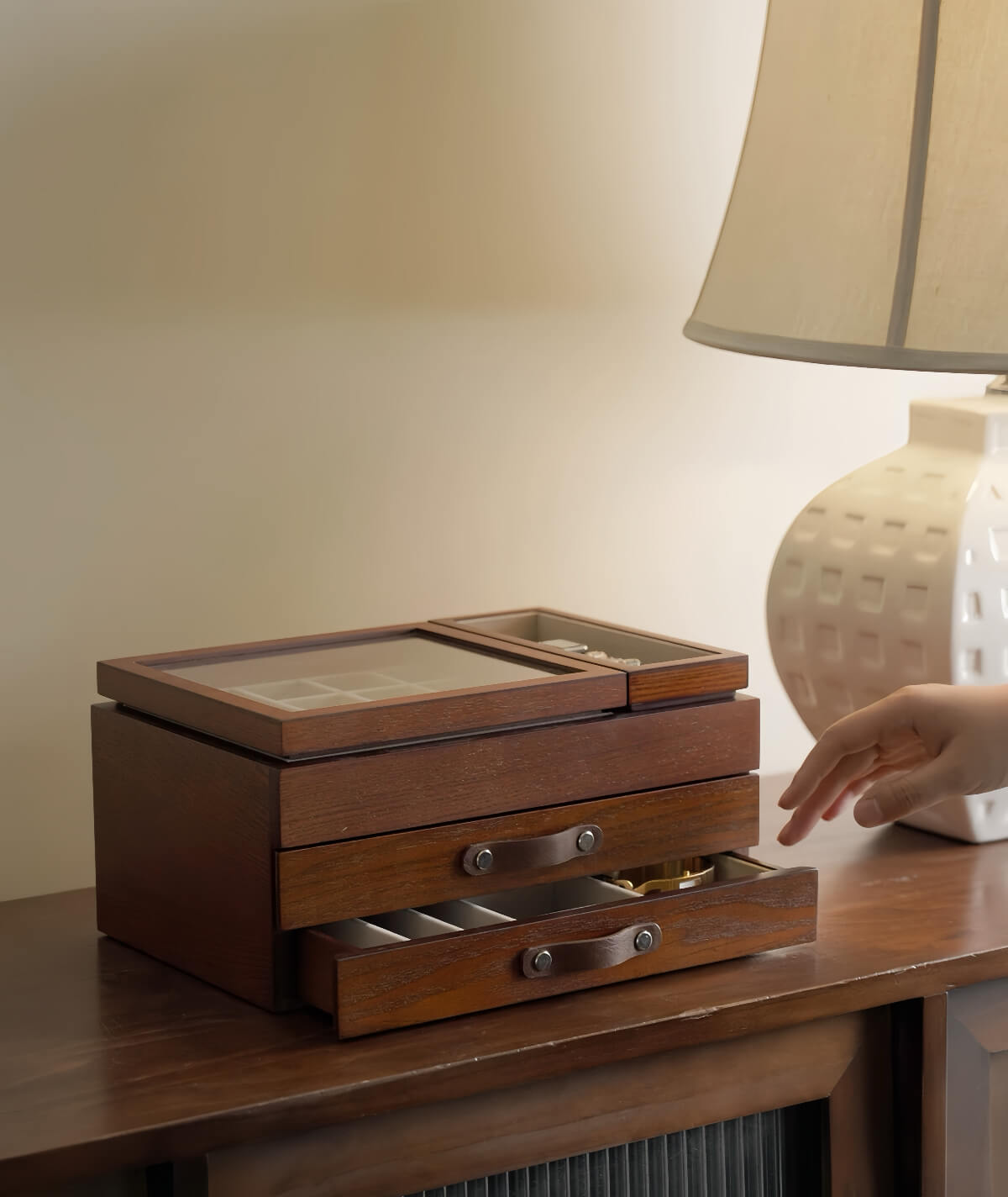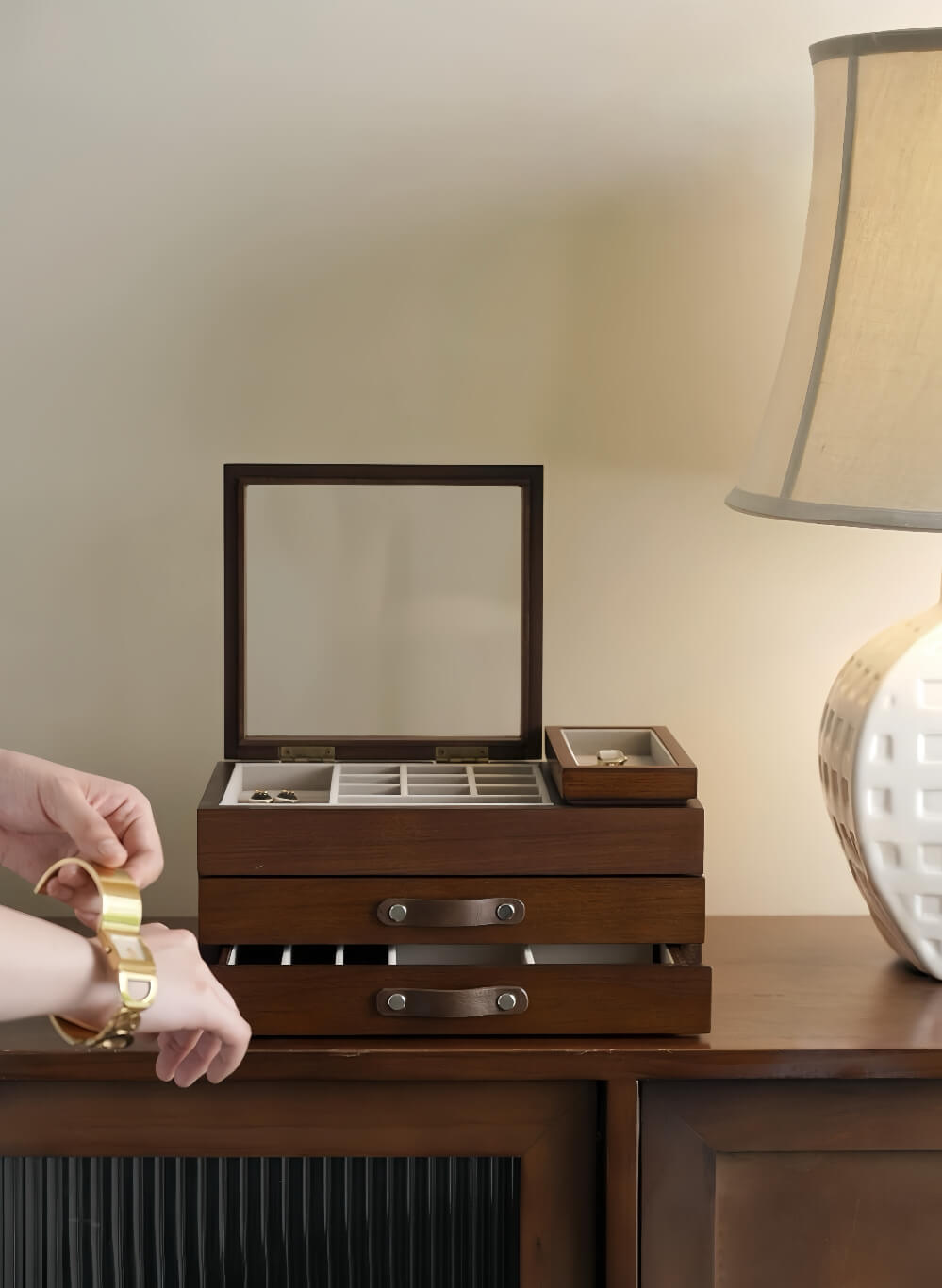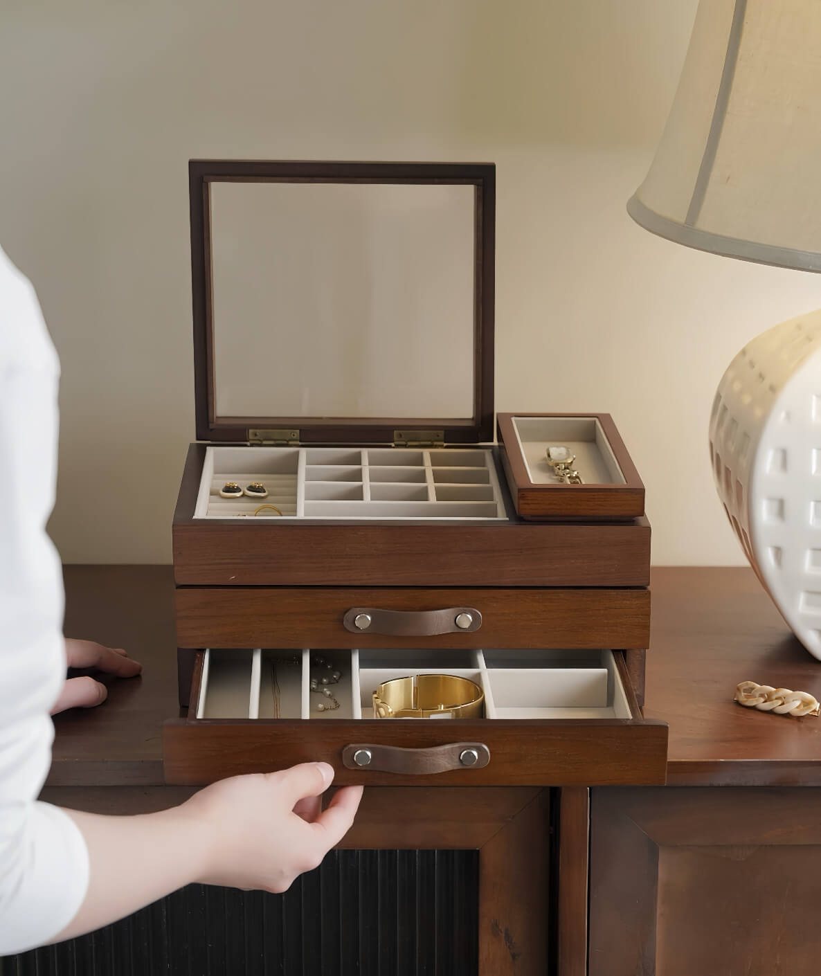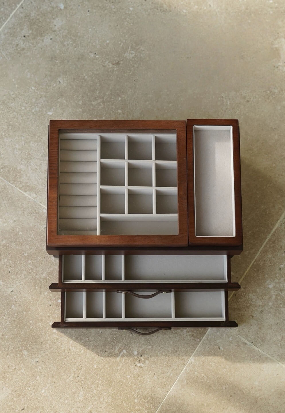 This tiered jewelry storage box, crafted from premium walnut, combines vintage elegance with expert craftsmanship. Designed to protect and organize your jewelry, its multiple layers ensure secure, separate compartments for delicate pieces. The antique finish adds timeless charm while preserving your collection’s integrity, making it an ideal choice for discerning jewelry enthusiasts.
