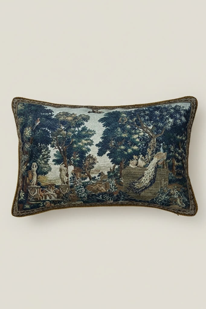 This exquisite cushion cover faithfully recreates the classic design of 17th-century Flemish Verdure landscape tapestries, bringing the golden age of European weaving arts into your home. The centerpiece features a majestic peacock perched beside a Roman-style fountain, surrounded by lush vegetation and florals, perfectly embodying the Verdure style's celebration of natural themes.