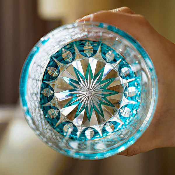 Inspired by the revered imperial symbol of Japan, the chrysanthemum ("Kiku"), combined with "Ao" , referring to shades of blue or green, creating an "Aokiku" – a green or blue chrysanthemum. This vibrant interpretation of the classic motif symbolizes longevity, rejuvenation, nobility, and prosperity, now imbued with the natural vitality and serenity of a verdant hue. The intricate patterns etched into this crystal glass combine the elegance of the chrysanthemum's radial form with a captivating green tint, suggesting both enduring strength and natural harmony. Holding this glass invites a moment of serene contemplation, making every sip an experience steeped in both cultural heritage and timeless elegance. The vibrant clarity of the crystal allows the rich hues of your favorite spirit to beautifully refract through the intricate design, enhancing the visual splendor with every turn, like sunlight dancing on a precious jade bloom.