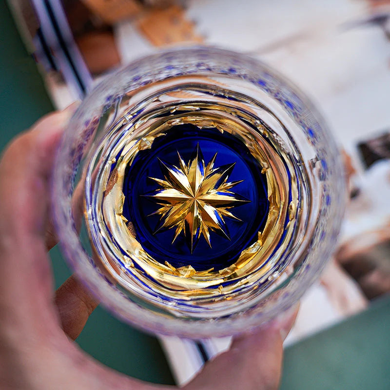 Inspired by the awe-inspiring brilliance of distant stars exploding into light, set against the deep, tranquil expanse of a midnight blue sky, the intricate patterns etched into this crystal glass evoke a sense of dynamic energy and serene mystery. The "Midnight Blue Starburst" motif captures the essence of a vibrant cosmos, symbolizing guidance, discovery, and the boundless energy of the universe. Holding this glass invites a moment of profound contemplation, making every sip an experience steeped in both universal wonder and refined elegance. The captivating midnight blue coloration of the crystal, combined with its brilliant facets, beautifully refracts light, transforming your beverage into an opulent display of luminous elegance, as if holding a piece of a sparkling, celestial galaxy in your hand.