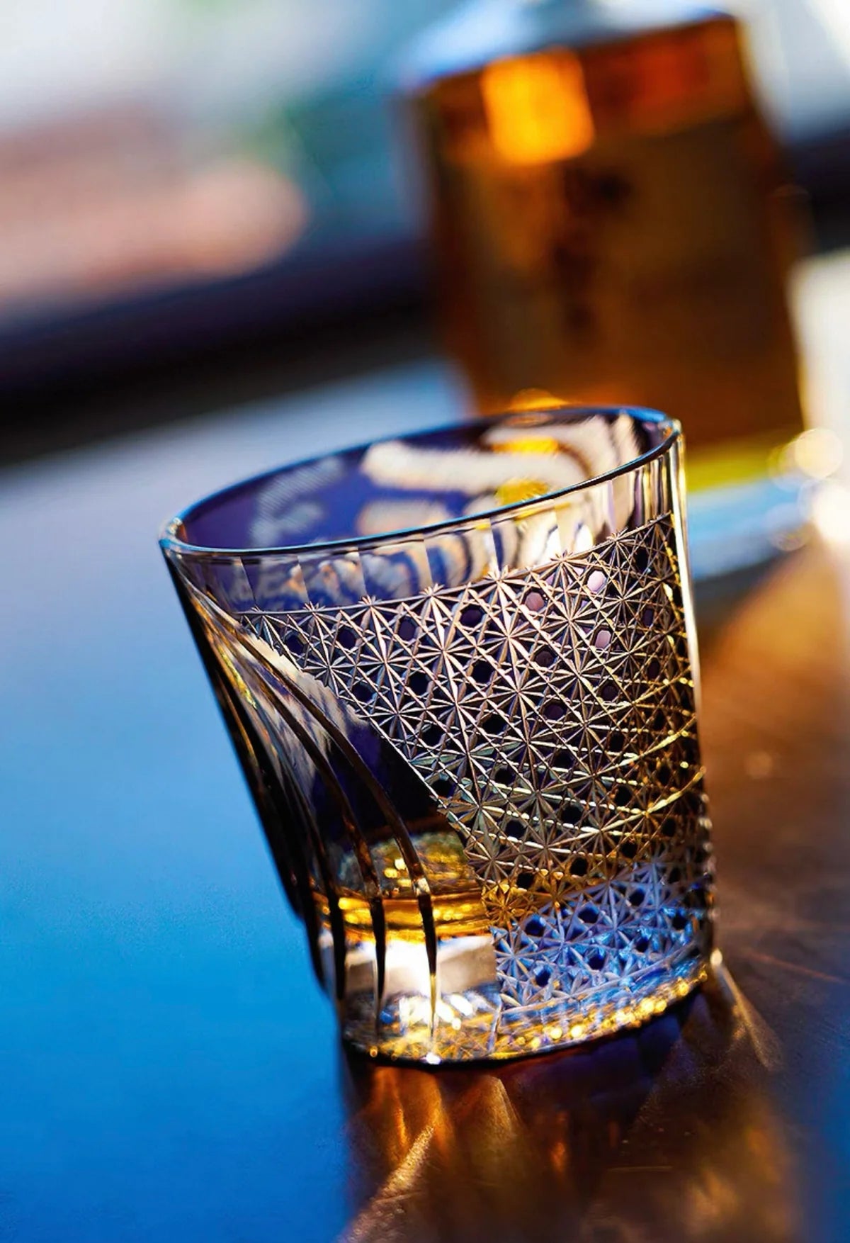 Edo Kiriko is a revered national traditional craft of Japan, with a history spanning centuries. This whiskey glass is handcrafted by seasoned artisans who expertly shape molten crystal glass at temperatures up to 1350°C. Each cut is a testament to their skill, with precise angles and depths that cause light to refract and create a dazzling, crystalline effect. This meticulous process ensures a stunning play of light and shadow, highlighting the glass's brilliant clarity.