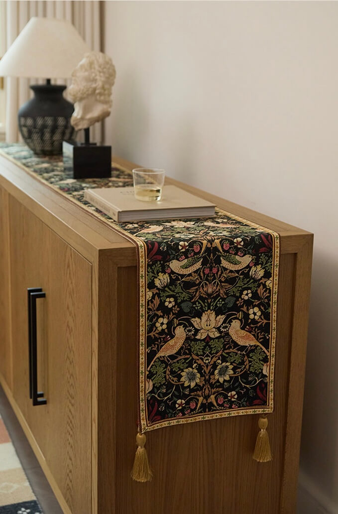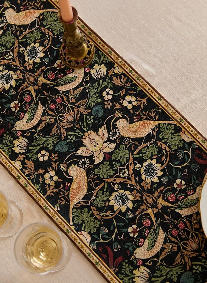 • 🎨 Morris Heritage Design:Hand-painted interpretation of William Morris's legendary 'Strawberry Thief' pattern. Each runner captures the spirit of 19th-century botanical artistry—birds nestled in flowering branches, rendered with museum-quality attention to detail.