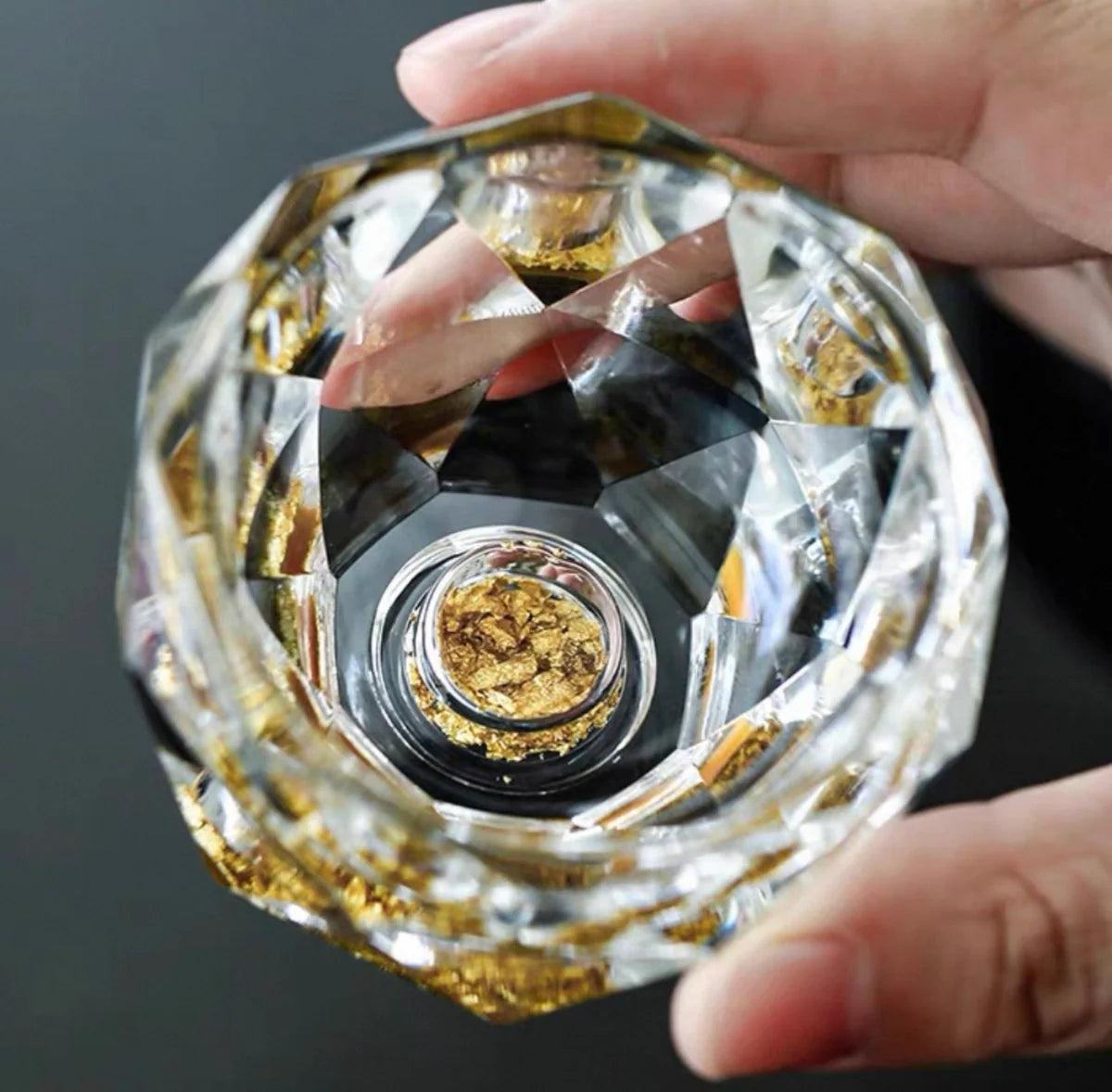 Each cup is a unique creation, meticulously embedded with genuine gold leaf that shimmers and reflects light, creating a stunning visual effect. The gold leaf is suspended within the crystal, giving the cup a sense of depth and elegance that elevates every sip. It’s more than a simple cup; it's a personal work of art that feels as luxurious as it looks.